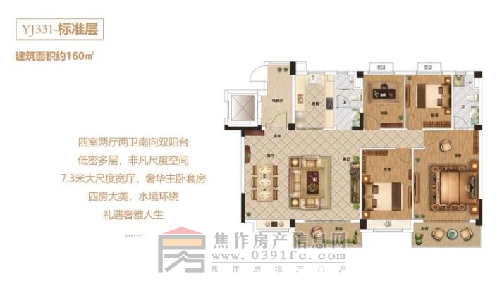 YJ331-標(biāo)準(zhǔn)層 四室兩廳兩衛(wèi)南向雙陽臺 低密多層,非凡尺度空間 7.3米大尺度寬廳,奢華主臥套房 四房大美,水境環(huán)繞 禮遇奢雅人生 咨詢電話:0391-8768882